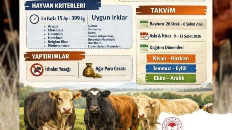 Edinilen bilgilere göre başvurular; 26 Ocak 2026 – 6 Şubat 2026 tarihleri arasında, yetiştiricinin bağlı bulunduğu İlçe Tarım ve Orman Müdürlüklerine dilekçe ile yapılacak. Yetiştiricilerin, ithal edilecek hayvanları hangi dönemde almak istediklerini ön başvuru dilekçesinde açıkça belirtmeleri gerekiyor. Belirtilen dönem dışında sonradan yapılacak dönem değişikliği taleplerinin kesinlikle değerlendirmeye alınmayacağı vurgulandı.