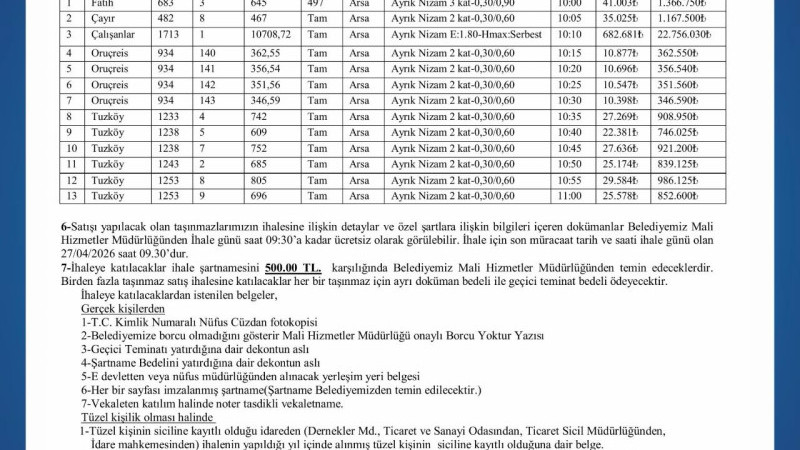 -İhale Tarihi ve Saati: 27 Nisan 2026, saat 10:00’da başlayacaktır (Her taşınmaz 5-10 dakika arayla ihale edilecektir).