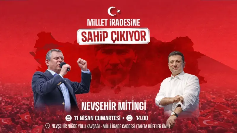 Cumhuriyet Halk Partisi Genel Başkanı Özgür Özel, “Millet İradesine Sahip Çıkıyor” mitingi kapsamında 11 Nisan 2026 Cumartesi günü Nevşehir'e geliyor.