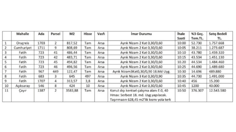 Gülşehir Belediyesi, Oruç Reis, Cumhuriyet, Fatih, Açıksaray ve Çayır Mahallesinde mülkiyetinde bulunan bazı taşınmazlarını satışa çıkardı.