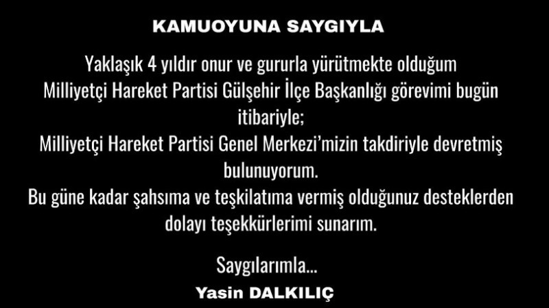 “Yaklaşık 4 yıldır onur ve gururla yürütmekte olduğum Milliyetçi Hareket Partisi Gülşehir İlçe Başkanlığı görevimi bugün itibariyle; Milliyetçi Hareket Partisi Genel Merkezimizin takdiriyle devretmiş bulunuyorum. Bugüne kadar şahsıma ve teşkilatıma vermiş olduğunuz desteklerden dolayı teşekkürlerimi sunarım. Saygılarımla…”