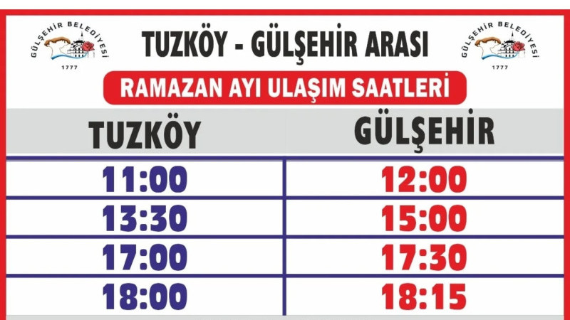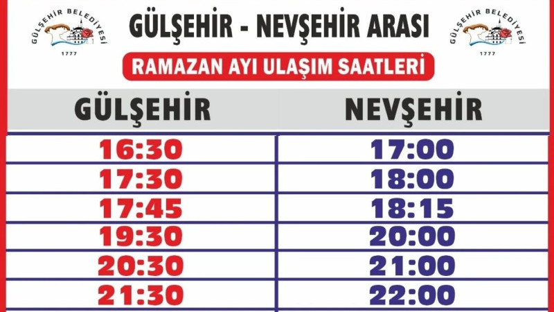 Gülşehir Belediyesi tarafından, ramazan ayı boyunca iftar saatlerine özel olarak, otobüs saatlerinde yeni düzenleme yapıldı.