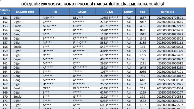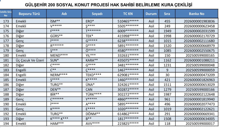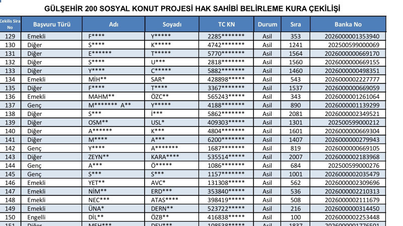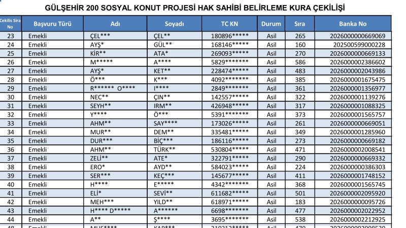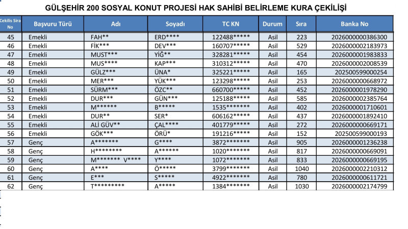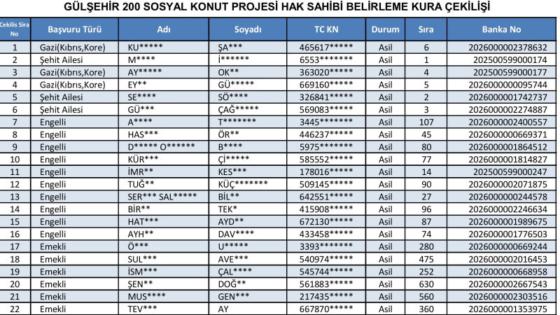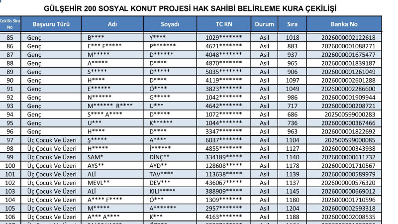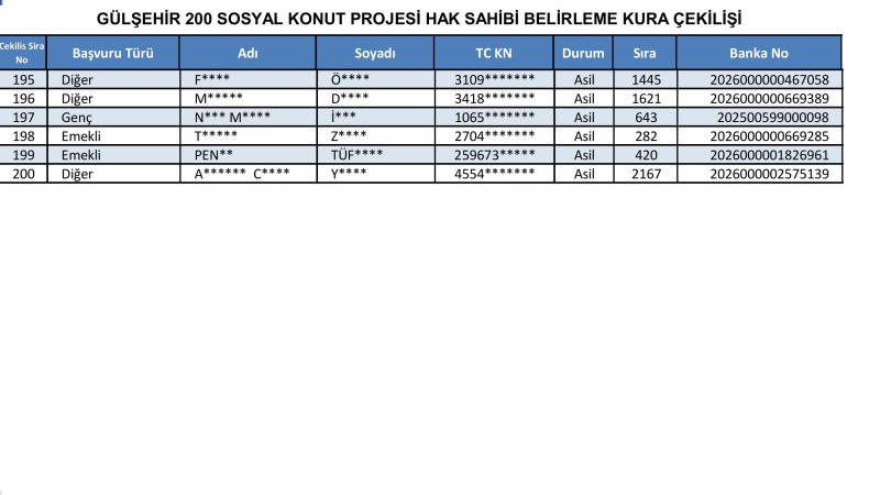 200 konutluk proje kapsamında Gülşehir’den başvurusu kabul edilen 2 bin 195 kişi arasından, 1+1 ve 2+1 daire almaya hak kazananlar yapılacak kura ile belirlendi. Kura çekimi, Nevşehir Hacı Bektaş Veli Üniversitesi Konferans Salonu’nda saat 11.00’de, noter huzurunda yapıldı. Kura sonuçlarının ardından hak sahipleri listeleri TOKİ’nin resmi internet sitesi üzerinden ilan edildi. Vatandaşlar, T.C. kimlik numaraları ile sonuç sorgulaması yapabilecek.