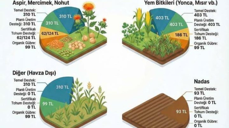 Aspir, mercimek ve nohut üretimi yapan çiftçilere dekara 310 TL temel ve planlı üretim desteği verilecek. Bu ürünlerde sertifikalı tohum desteği 62 TL ile 124 TL arasında değişirken, organik gübre desteği 99 TL olarak uygulanacak.