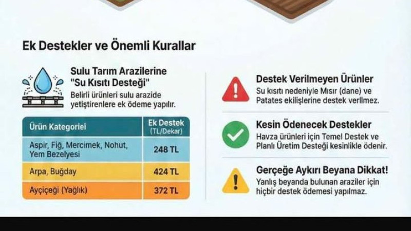 Yetkililer, su kısıtı nedeniyle dane mısır ve patates ekilişlerine destek verilmeyeceğini hatırlattı. Ayrıca, gerçeğe aykırı beyanda bulunan üreticilere hiçbir destek ödemesi yapılmayacağı belirtildi.