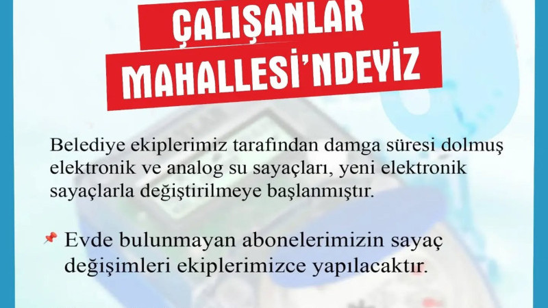 Belediye tarafından yapılan açıklamada, evde bulunmayan abonelerin sayaç değişimlerinin ekiplerce gerçekleştirileceği, değişim işlemi tamamlanan vatandaşların ise gerekli evraklarla birlikte belediyeye başvurarak kart tanımlama işlemlerini yaptırmaları gerektiği belirtildi.