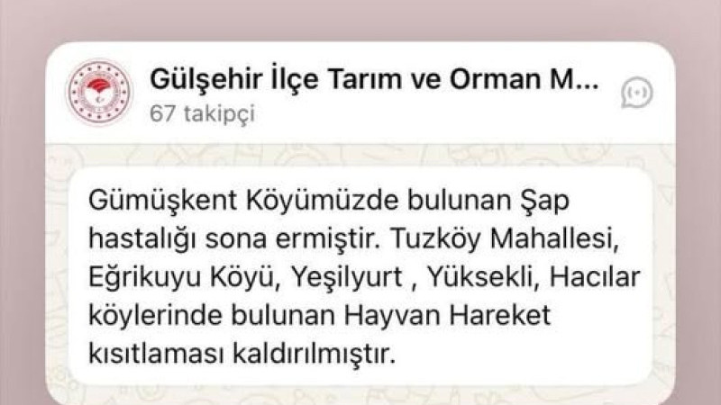 Gülşehir İlçe Tarım ve Orman Müdürlüğü’nden edinilen bilgilere göre; Tuzköy Mahallesi ile ilçeye bağlı Eğrikuyu, Yüksekli, Yeşilyurt ve Hacılar köylerinde uygulanan hayvan hareket kısıtlaması kaldırıldı.