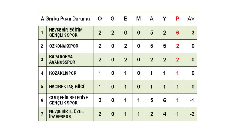 A Grubundaki karşılaşmalarda Nevşehir Eğitim Gençlik Spor, Gülşehir Belediye Gençlik Spor’u 2-1 mağlup ederken, Özkonakspor - Kapadokya Avanosspor ve Kozaklıspor - Nevşehir İl Özel İdarespor müsabakaları 1 – 1 berabere sonuçlandı. Hacıbektaşgücü haftayı maç yapmadan geçirdi.