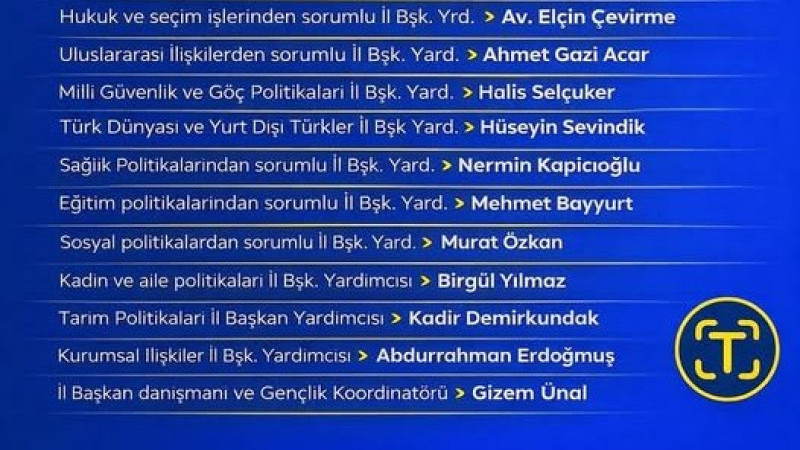 Yeni dönemde İYİ Parti Nevşehir İl Başkanlığı’nda görev alan isimler ve sorumluluk alanları şu şekilde belirlendi: