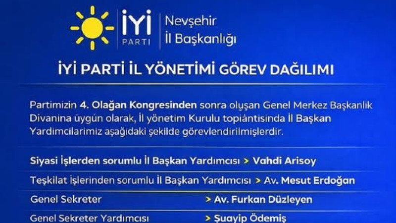 İYİ Parti Nevşehir İl Başkanlığı’nda, yaklaşık iki ay önce gerçekleştirilen 4. Olağan İl Kongresinin ardından yeni döneme ilişkin görev dağılımı tamamlandı. İYİ Parti Nevşehir İl Başkanı Ömer Ay liderliğinde oluşturulan yeni il yönetimi, İl Yönetim Kurulu toplantısında belirlenen görevlerle çalışmalarına resmen başladı.