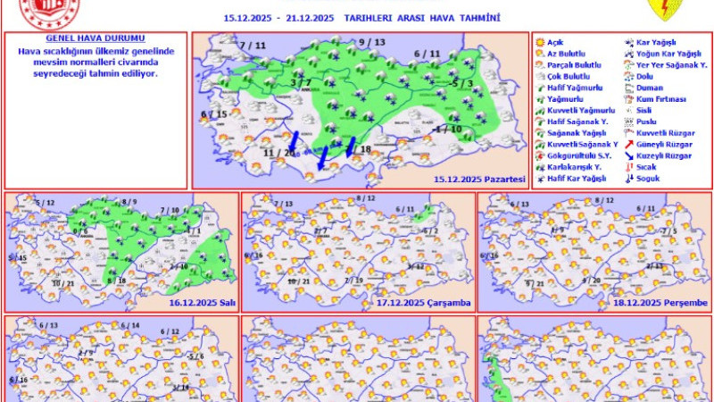 Meteoroloji verilerine göre: 15 Aralık 2025 Pazartesi günü İl genelinde karla karışık yağmur, 16 Aralık 2025 Salı günü kar yağışı etkili olacak.