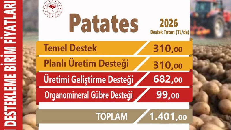 Açıklanan destek programına göre patates üretimi yapan çiftçilere dekar başına toplam Bin 401 TL ödeme yapılacak. Destekler farklı kalemler halinde üreticilere sunulacak.