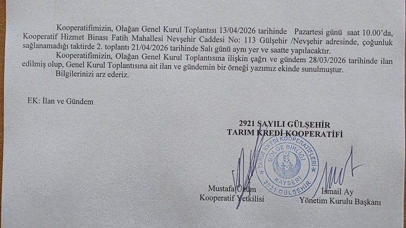 Genel Kurulun ilk toplantısı 13 Nisan 2026 Pazartesi günü saat 10.00’da gerçekleştirilecek. Toplantı, kooperatifin kendi hizmet binasında (Fatih Mahallesi, Nevşehir Caddesi No: 113, Gülşehir/Nevşehir) yapılacak.