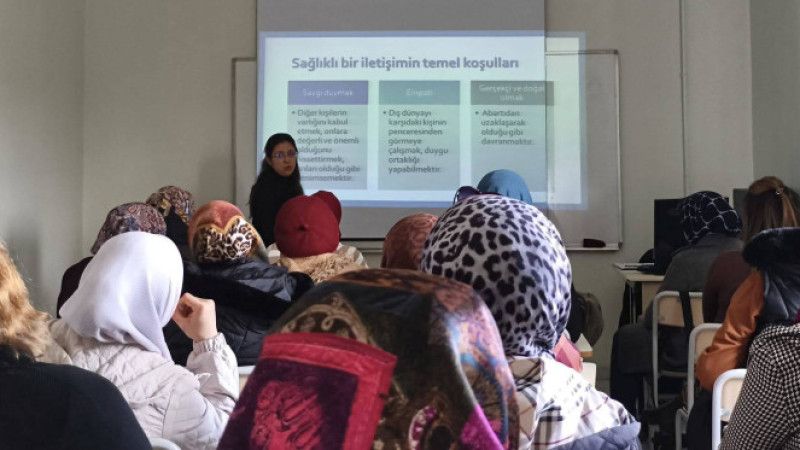 Aile ve Toplum Hizmetleri Birimi tarafından verilen eminerde, aile bireyleri arasındaki sağlıklı iletişimin önemi vurgulanırken; empati kurma becerileri, etkili dinleme yöntemleri ve çatışma çözme teknikleri ele alındı. Aile içi iletişimde sevgi dili, çocuklarla doğru iletişim kurma yolları ile eşler arası saygı ve anlayışın önemi detaylı şekilde anlatıldı. Ayrıca dijital çağın getirdiği değişimlere de değinilerek, aile bağlarının korunmasına yönelik öneriler paylaşıldı.