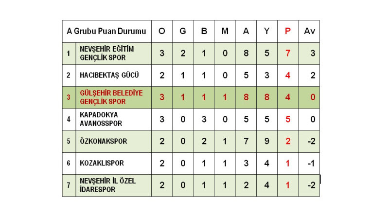 A Grubundaki karşılaşmalarda Gülşehir Belediye Gençlik Spor Kozaklıspor’u 3-2 mağlup ederken, Hacıbektaşgücü Özkonakspor müsabakası 3-3 berabere sonuçlandı. Nevşehir İl Özel İdarespor haftayı maç yapmadan geçirdi.