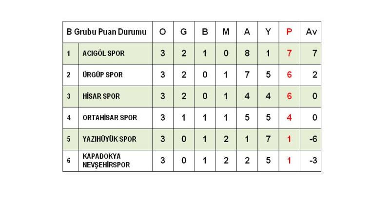 B Grubunda oynanan maçlarda, Acıgölspor deplasmanda Yazıhüyükspor’u 5-0, Hisarspor’da Ortahisarspor’u 2-1 mağlup ederken, Ürgüpspor rakibi Kapadokya Nevşehirspor’u 3-2 mağlup etmeyi başardı.